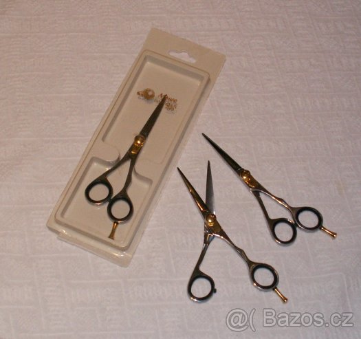 Prodám nové profesionální kadeřnické nůžky, německá ocel ,,Solingen,,. Klouzavý střih, samobrusné, lehké do ruky. Velké množství, při větším odběru sleva .Dvě délky černostříbrné, zlatostříbrné. č. 5, č. 5,5. Možno zaslat i poštou.
