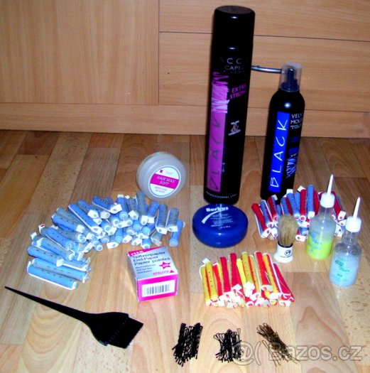 Prodám profesionální kadeřnické potřeby. Mýdlo na holení Barbus (párkrát použitý), štětec na holení, papírky na trvalou, natáčky na trvalou silné (52 ks), střední (38 ks), tenké (23 ks), preparační roztok + ustalovač (Cold wawe, jednou použité), profesionální lak na vlasy (cca. 200 ml.), profesionální tužidlo na vlasy (plné pouze jednou použité), profesionální vosk na vlasy (pouze jednou použitý), černé vlásenky dlouhé (20 ks), černé vlásenky krátké (20 ks), pérka do vlasů zlatá (20 ks) + štětec na barvení zdarma. Kontakt: Lucy47@seznam.cz